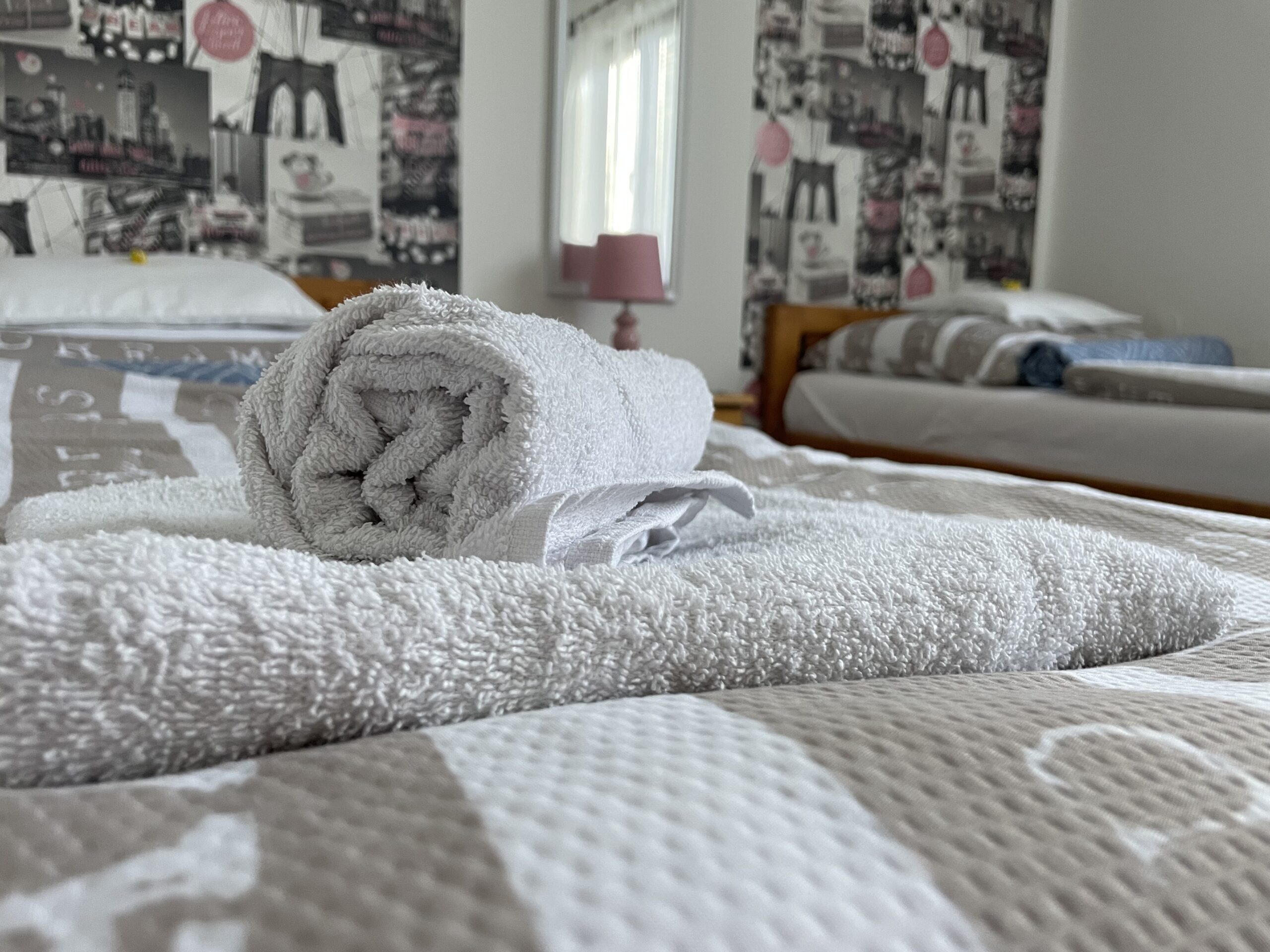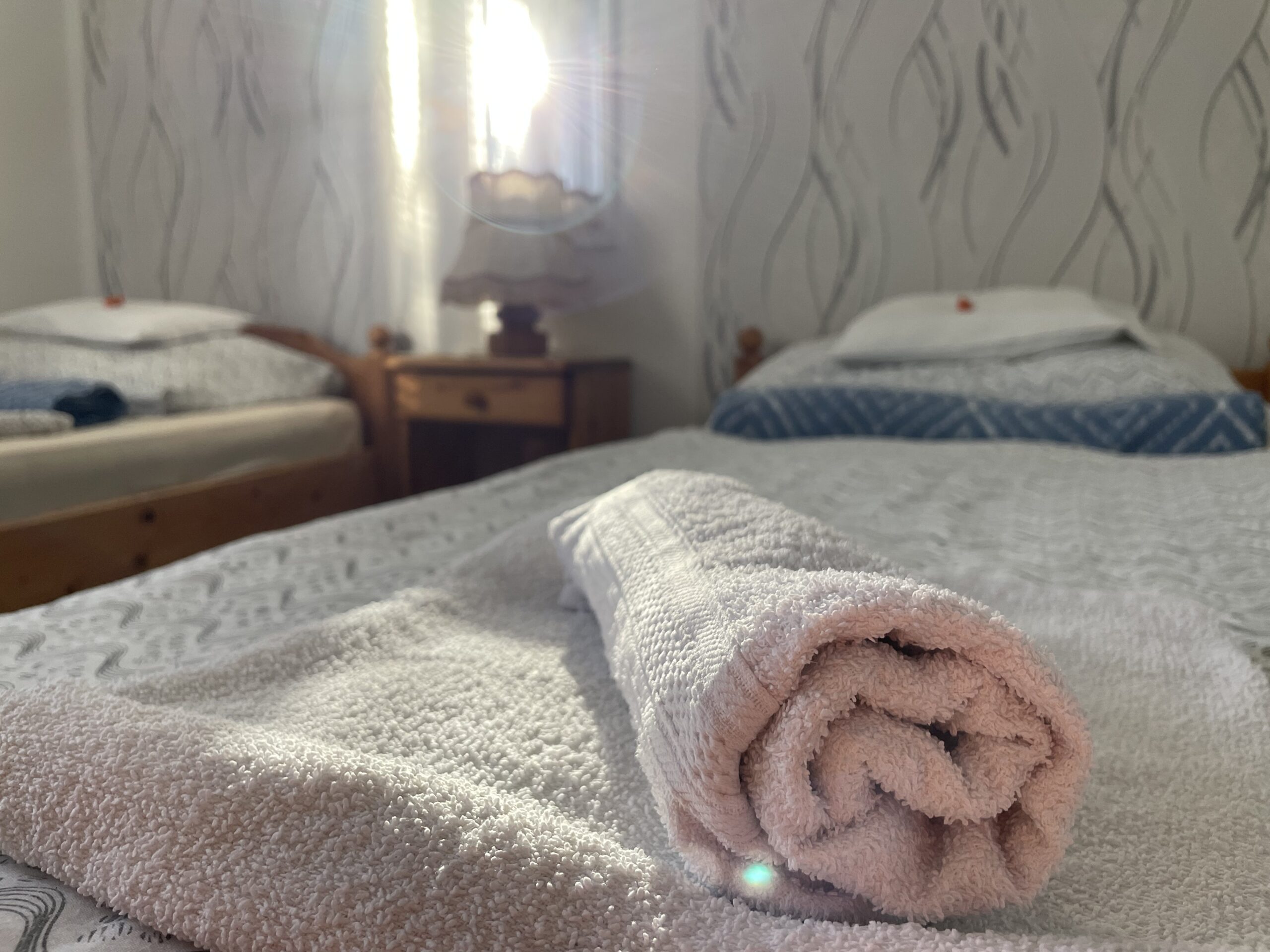 We have rooms with two or three beds,all of which can be equipped with an extra bed,too.